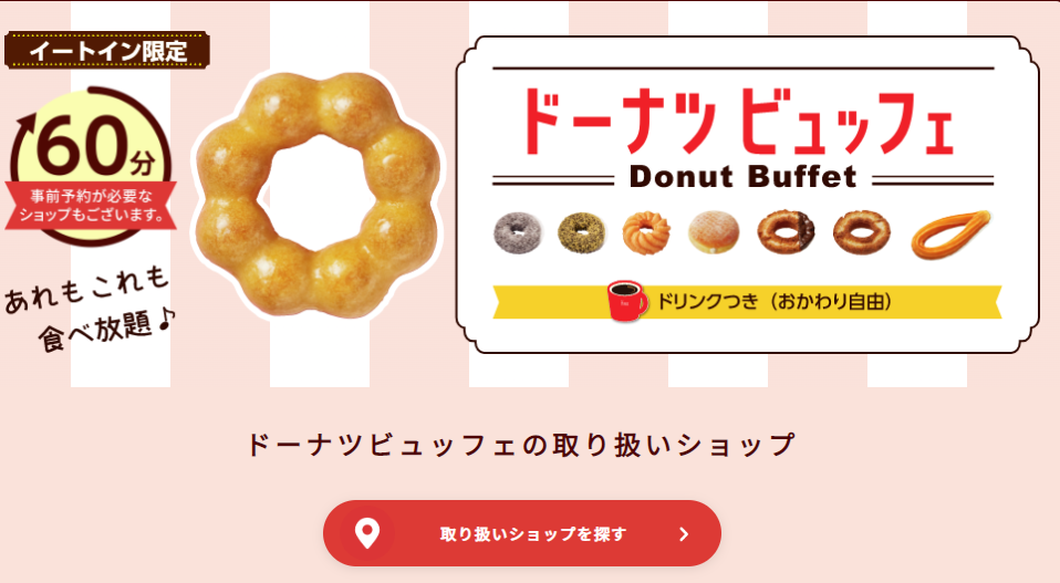 スイーツ系の食べ放題は60分や90分制のお店が多いので、ミスドの食べ放題も一般的な時間と言えますね!